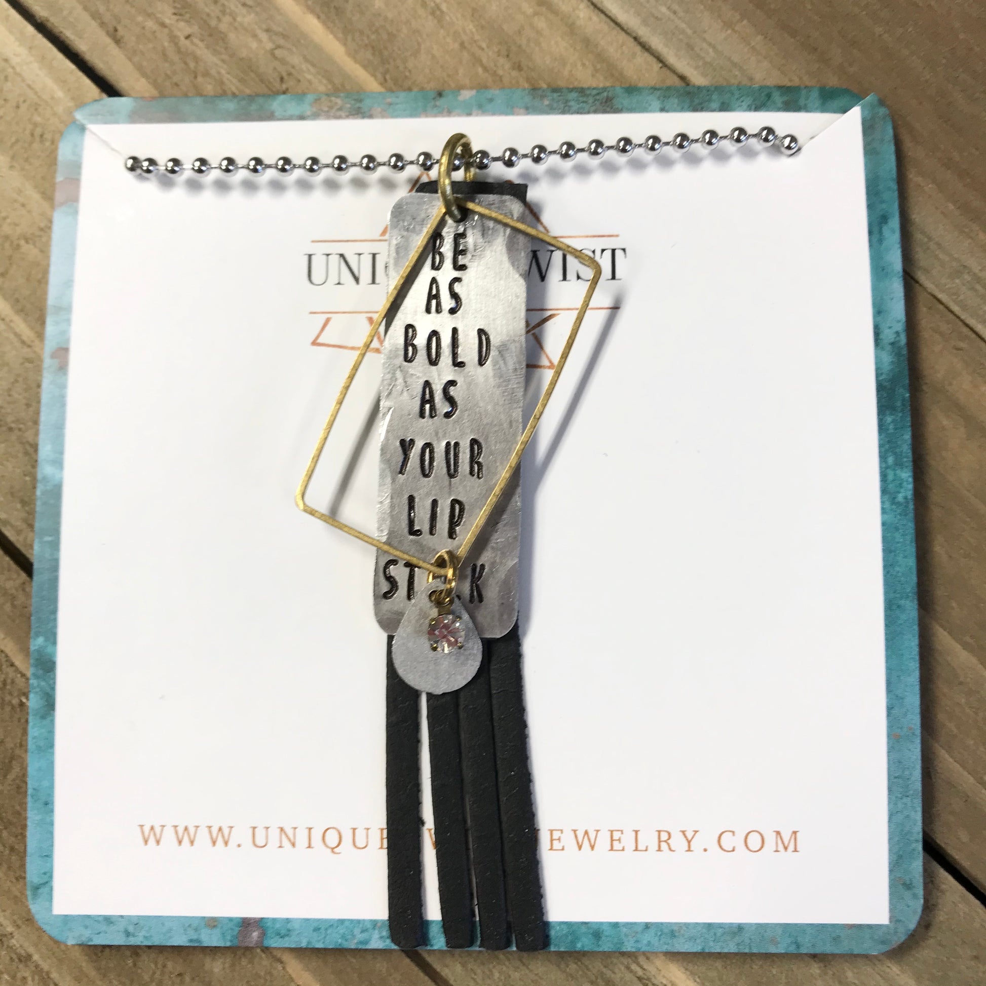 Hand stamped aluminum blank with brass & copper charms, and a lucite gem on a 30” stainless steel ball chain with a ball clasp
